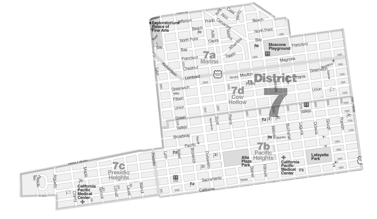 District 7 on the Northern end of the city is one of the most popular areas for young professionals and families which is why it’s some of the most expensive real estate in San Francisco. There are four distinct communities in district 7. Pacific Heights and Presidio Heights have long been considered the most coveted places in the city with mansions and grand Victorian homes from a bygone era. The Marina and Cow Hollow have a younger vibe with smaller homes and condos. The main shopping and dining streets for Pacific Heights and Presidio Heights are Fillmore and Sacramento which have some classic cafes, notable restaurants and design stores. Chestnut Street and Union Street cater to a younger audience as well as families with hip bars, trendy restaurants and stylish boutiques. With easy access to the water’s edge, people living in district 7 enjoy the beach, boating and walks to the Golden Gate Bridge. The Presidio National Park is a wooded wonderland with parks, playing fields and hiking trails that provides another scenic outdoor experience for residents and guests alike.