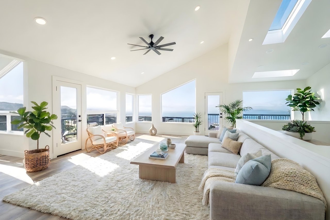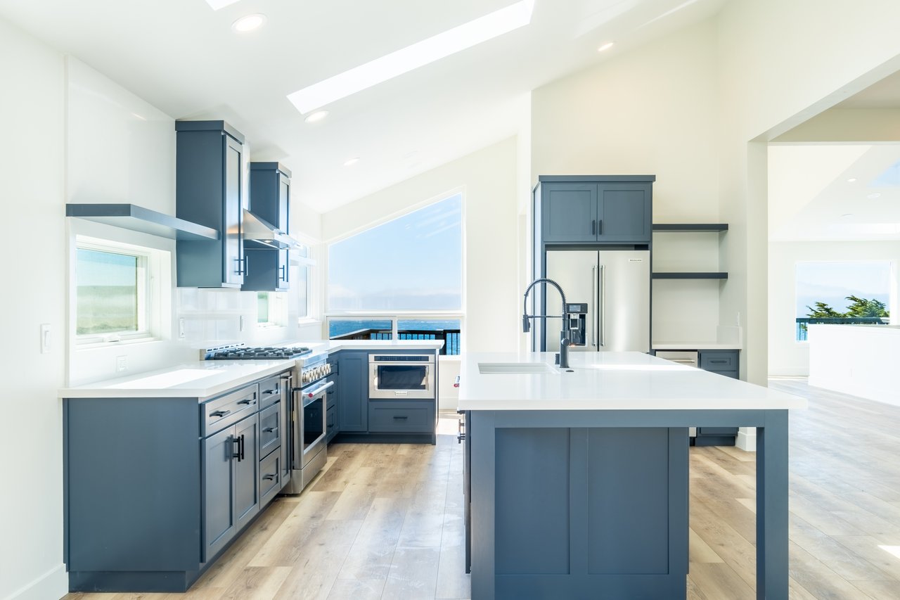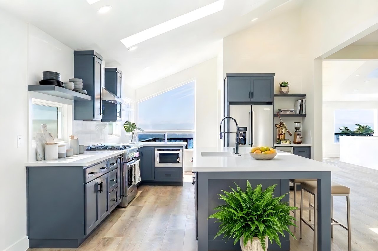 At just over 2,800 square feet, the home has been thoughtfully reimagined by the current owners, with an emphasis on light and volume. High ceilings and an abundance of skylights flood the great room with natural light, while generous windows frame sweeping seascapes that shift with the tides and seasons. The open-plan living and dining area is anchored by a brand-new chef’s kitchen featuring a commanding island, pristine never-used appliances, and warm light engineered flooring that flows throughout the home — an interior palette that feels both modern and deeply coastal. Then walls provide a stunning backdrop for art, while a breakfast nook and eat-in counter invite the slower mornings this setting calls for.