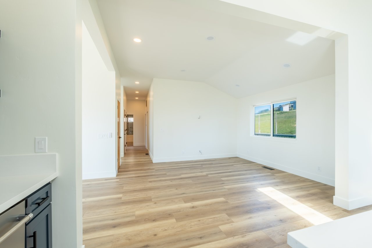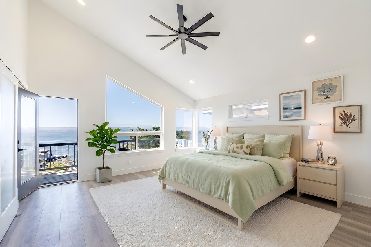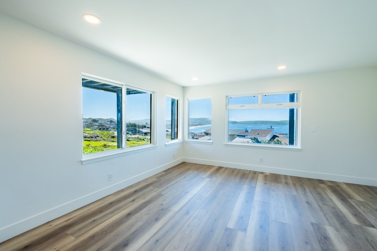 At just over 2,800 square feet, the home has been thoughtfully reimagined by the current owners, with an emphasis on light and volume. High ceilings and an abundance of skylights flood the great room with natural light, while generous windows frame sweeping seascapes that shift with the tides and seasons. The open-plan living and dining area is anchored by a brand-new chef’s kitchen featuring a commanding island, pristine never-used appliances, and warm light engineered flooring that flows throughout the home — an interior palette that feels both modern and deeply coastal. Then walls provide a stunning backdrop for art, while a breakfast nook and eat-in counter invite the slower mornings this setting calls for.
